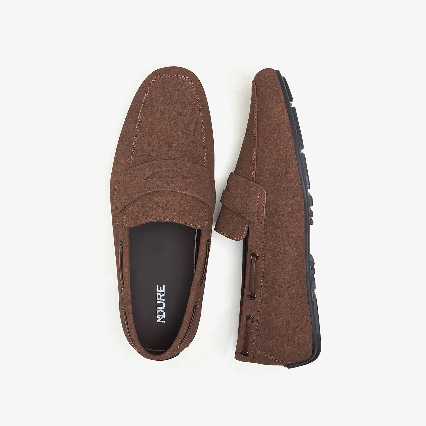 Men’s driving loafers with a penny strap and clean moc stitching. The slip-on design and slim profile give a modern, minimal look.